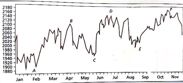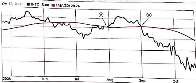 A point like A — where the current stock price breaks up through the moving average — gets read as an “upward trend.” Conversely, a point like B — where the price breaks down through the average — gets read as a “downward trend.” Apparently.