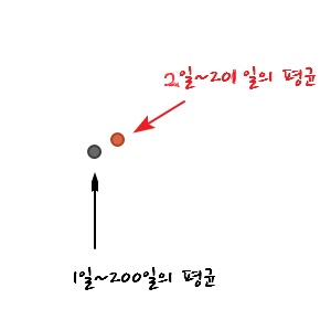 If the first point is the average of day 1 through day 200, then the very next plotted point drops day 1 and adds day 201 to compute its average,
