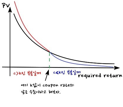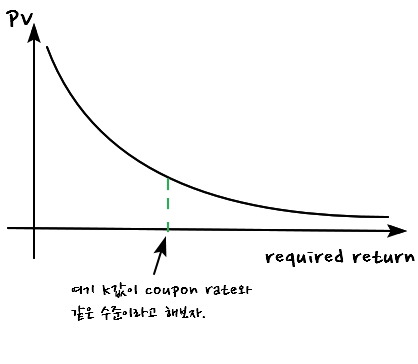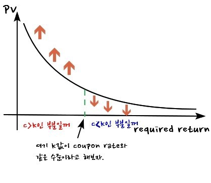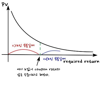 - When coupon rate $=$ required return: doesn’t matter what maturity does, PV stays put.