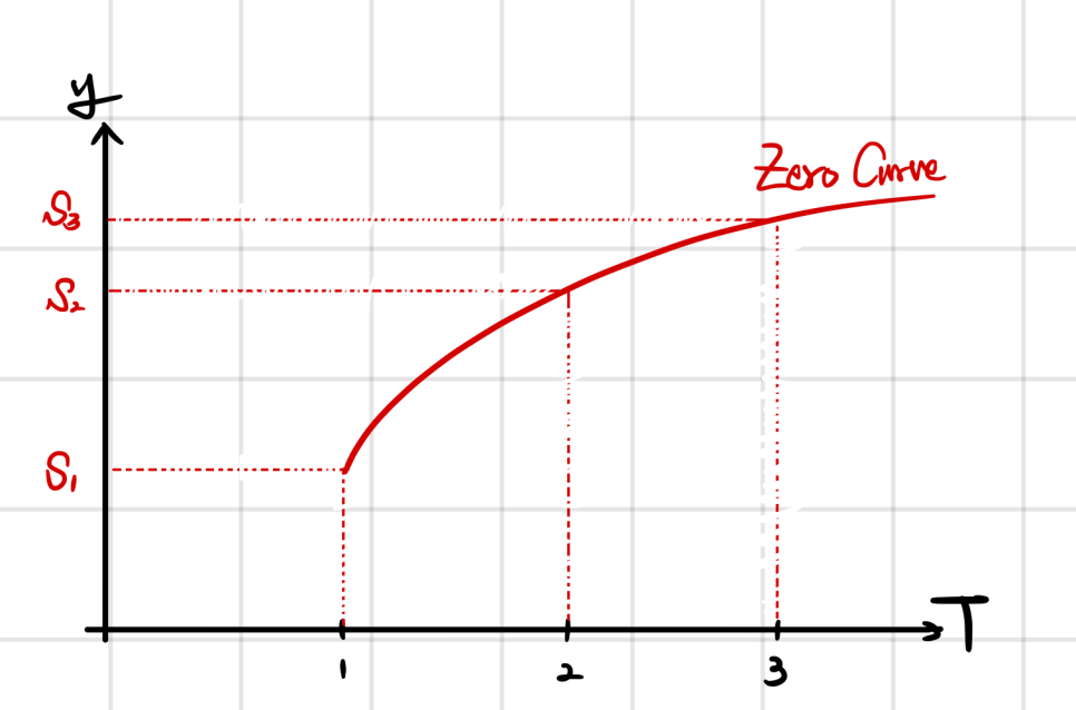 In the market, $s_1, s_2, s_3, \ldots$ can all be observed, and plotting them on a $T$–$y$ axis gives us what we called the Spot Curve, or Zero Curve.
