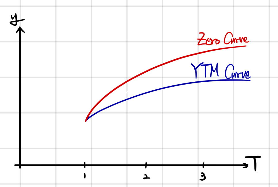 So if the spot curve is upward, YTM gets drawn below the spot. Conversely, if spot were downward, YTM would sit above spot.