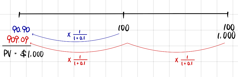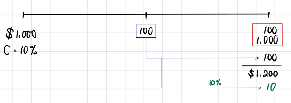 $1{,}000(1+0.1)(1+0.1) = \$1{,}210$ after 2 years.