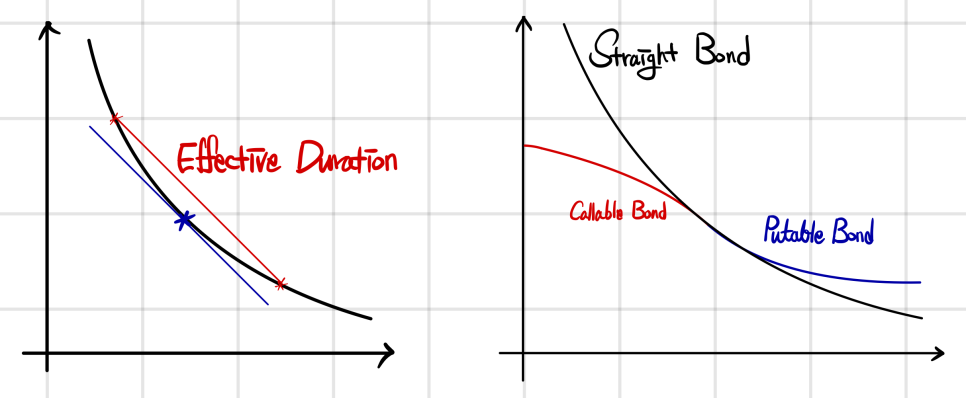 When you visualize Effective Duration, it looks like this — so whether callable or putable, Duration comes out smaller than for a straight bond!!!