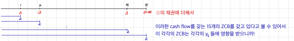 Now in direction ➁, right — I get that this one’s trading at a premium because the coupon is above the world’s required yield. But still, the only thing different from the bond we just looked at is its CF. This bond should also not have any $y_i$ other than $y_{15}$ affecting its price, right?