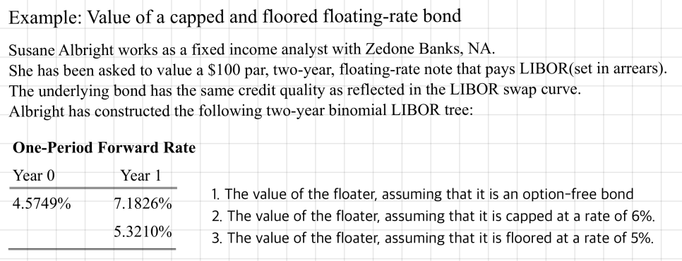 $$\text{Value of a capped floater} = \text{value of a straight floater} - \text{value of the embedded cap}$$$$\text{Value of a floored floater} = \text{value of a straight floater} + \text{value of the embedded floor}$$OK so — how do we actually value these?!