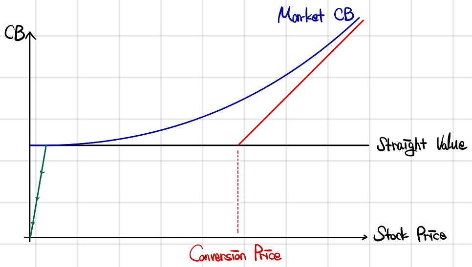 Even if the stock price drops to 0, the SB part of the CB still has bond value sitting there, so the whole thing has a floor under it.