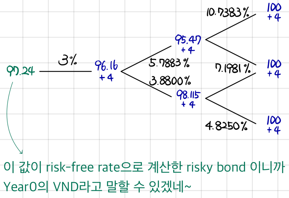 $$\text{Risky Bond Price} = \text{VND} - \text{CVA}$$Up till now, whenever we calculated CVA, we just pinned YTM at some value and discounted with it. We hadn’t been using a tree for this. But actually — you can do this just fine with a tree model. Let’s practice.