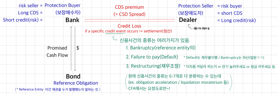 And credit derivatives actually come in a bunch of flavors — Total Return Swap, Credit Spread Option, Credit Spread Forward, all sorts. But apparently in the CFA we only touch CDS, and even then just a tiny sliver of it. heh (Thanks, CFA~)