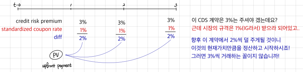 The present value of the difference between the standardized coupon rate and the credit spread on the reference obligation is paid upfront by one of the parties to the contract.
