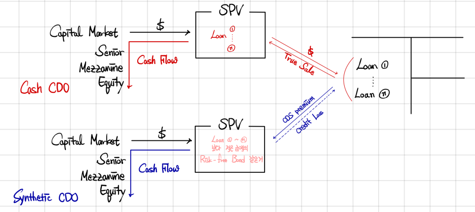 A Cash CDO actually holds the loans, while a Synthetic CDO is built out of derivative contracts β but the risk both are taking on is the same.