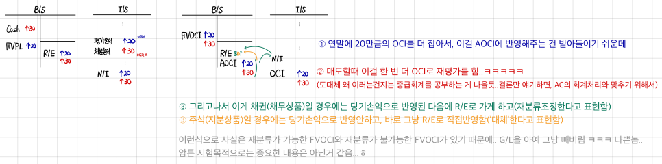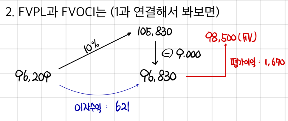 For FVOCI — the 621 in interest has to go through current P&L, and the unrealized-feeling valuation gain goes through OCI and lands in AOCI…