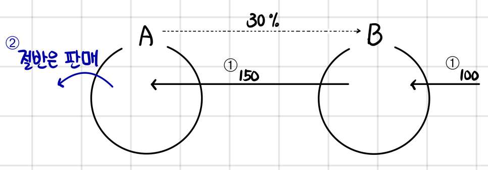 ➀ A owns 30% of B, and because that puts it in equity-method-investment territory, A is doing equity-method accounting on B. Now say B bought some goods for 100 and sold them to A for 150. And by period-end, A hasn’t sold any of it onward to anybody else.