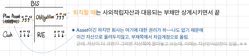 So every year — assuming the employee could leave in year XX — you book a chunk of expected severance as an expense on the I/S, and that expense piles up as a liability on the B/S. Then when the employee actually really resigns, Cash↓ / Obligation↓ cancel out, and look at that — the cost matching that Cash $100M↓ has been getting expensed bit by bit consistently over the years, so now the Matching Principle is happy! This whole setup is called the severance pay system.