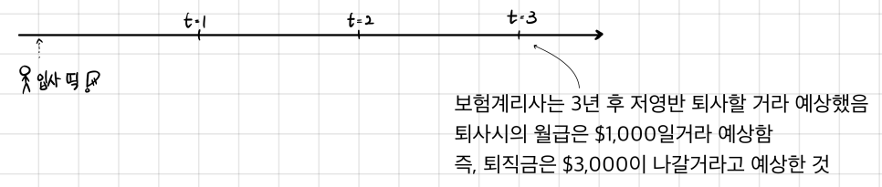 Easy example — say the retirement benefit policy was salary × years of service, and then