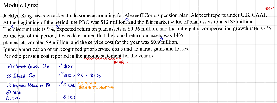 and the leftover $1,000 gets booked as Current Service Cost — done.