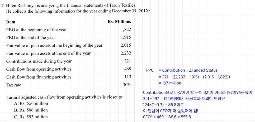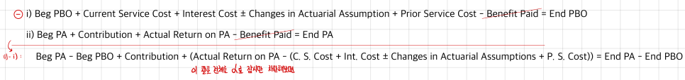 $$\text{i) TPPC} = \text{Employer Contribution} - (\text{End. Funded Status} - \text{Beg. Funded Status}) = \text{Contribution} - \Delta\text{Funded Status}$$$$\text{ii) TPPC} = \text{Current Service Cost}$$$$+ \text{Interest Cost}$$$$- \text{Actual Return on PA}$$$$- \text{Actuarial Losses/Gains due to Changes in Assumption affecting PBO}$$$$+ \text{Prior Service Cost}$$Rather than just following what the book does, let’s approach this conceptually for a sec. Our Pension Expense formula is: