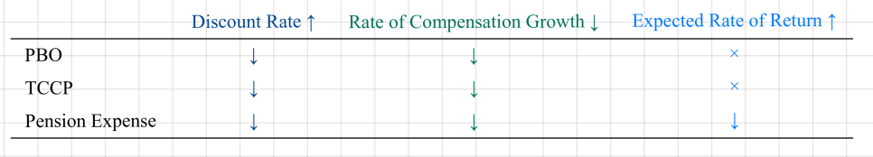 For PV of PBO — if you use a big discount rate, the PV comes out smaller. So PBO shrinks. Then Current Service Cost shrinks. So Pension Expense on the I/S shrinks, and TPPC shrinks too —