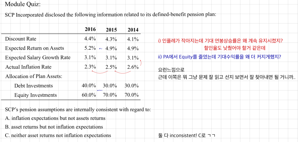 On assumptions in general — the analyst should look at the assumptions the company is using and notice if anything looks inconsistent. So expect a question that asks you to spot the inconsistency.