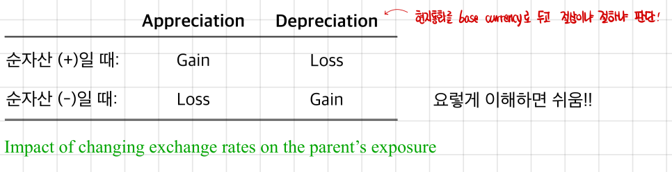 If you think about it this way — the foreign sub’s Net Assets can be understood as being exposed to the local exchange rate. Then, depending on whether the Net Assets are strong or weak —