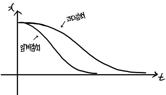 $$m\ddot {x}\quad +\quad c\dot {x}\quad +\quad kx\quad =\quad 0\\ \ddot {x}\quad +\quad \frac {c}{m}\dot {x}\quad +\quad \frac {k}{m}x\quad =\quad 0\\ \frac {c}{m}\quad \equiv \quad 2\gamma \quad ,\quad \frac {k}{m}\equiv \quad w_{0}^{2} \\ \ddot {x}\quad +\quad 2\gamma \dot {x}\quad +\quad w_{0}^{2}x\quad =\quad 0\\ (D^{2}\quad +\quad 2\gamma D\quad +\quad w_{0}^{2})x\quad =\quad 0\\ (D-(-\gamma +\sqrt {\gamma^{2}-w_{0}^{2}}))(D-(-\gamma -\sqrt {\gamma^{2}-w_{0}^{2}}))x\quad =\quad 0\\ \therefore \quad x\quad =\quad Ae^{\left( -\gamma +\sqrt {\gamma^{2}-w_{0}^{2}} \right) t}\quad +\quad Be^{\left( -\gamma -\sqrt {\gamma^{2}-w_{0}^{2}} \right) t}$$<WAIT WAIT WAIT WAIT WAIT!!!!!!!