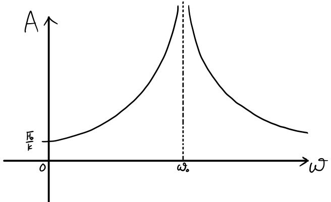 $$A(w)\quad =\quad \frac {F_{0}/m}{\sqrt {(w_{0}^{2}-w^{2})^{2}\quad +\quad 4\gamma^{2}w^{2}}} \\ \frac {dA(w)}{dt}\quad =\quad \frac {F_{0}}{m}\left( -\frac {1}{2}\left( (w_{0}^{2}-w^{2})^{2}\quad +\quad 4\gamma^{2}w^{2} \right)^{-3/2}\cdot \left( 2(w_{0}^{2}-w^{2})\cdot (-2w)+8\gamma^{2}w \right) \right) \\ \quad =\quad -\frac {F_{0}}{2m}\left( (w_{0}^{2}-w^{2})^{2}\quad +\quad 4\gamma^{2}w^{2} \right)^{-3/2}\cdot \left( -4w(w_{0}^{2}-w^{2})+8\gamma^{2}w \right)$$$$\text{when the red part hits }0\text{, we get }\frac {dA(w)}{dt}=0: \\ 4w(w_{0}^{2}-w^{2})\quad =\quad 8\gamma^{2}w\\ w^{2}\quad =\quad w_{0}^{2}-2\gamma^{2}\\ w\quad =\quad \sqrt {w_{0}^{2}-2\gamma^{2}}\quad \text{— at this }w,\ A(w)\text{ is maxed out.}\\ \quad \text{let's give this frequency its own name: }w_{r}\text{, the resonance frequency.} \\ \therefore w_{r}^{2}\quad =\quad w_{0}^{2}-2\gamma^{2}\quad //\quad (cf.\quad \text{don't confuse this with the damped frequency }w_{d}^{2}\quad =\quad w_{0}^{2}\quad -\quad \gamma^{2}!) \\ \quad (ccf.\quad \text{and the relationship between }w_{r}\text{ and }w_{d}\text{ is }w_{r}^{2}\quad =\quad w_{d}^{2}-\quad \gamma^{2}\text{ — apparently that's just a thing that exists.})$$$$\text{now let's find }A_{max}: \\ A_{max}\quad =\quad A(w_{r})\quad =\quad \frac {F_{0}/m}{\sqrt {\left( w_{0}^{2}-(w_{0}^{2}-2\gamma^{2}) \right)^{2}+4\gamma^{2}(w_{0}^{2}-2\gamma^{2})}}\\ \quad =\frac {F_{0}/m}{\sqrt {4\gamma^{2}+4\gamma^{2}(w_{0}^{2}-2\gamma^{2})}}\quad =\quad \frac {F_{0}/m}{2\gamma \sqrt {w_{0}^{2}-\gamma^{2}}}\quad \cong \quad \frac {F_{0}/m}{2\gamma w_{0}}$$Originally written in Korean on my Naver blog (2015-06). Translated to English for gdpark.blog.