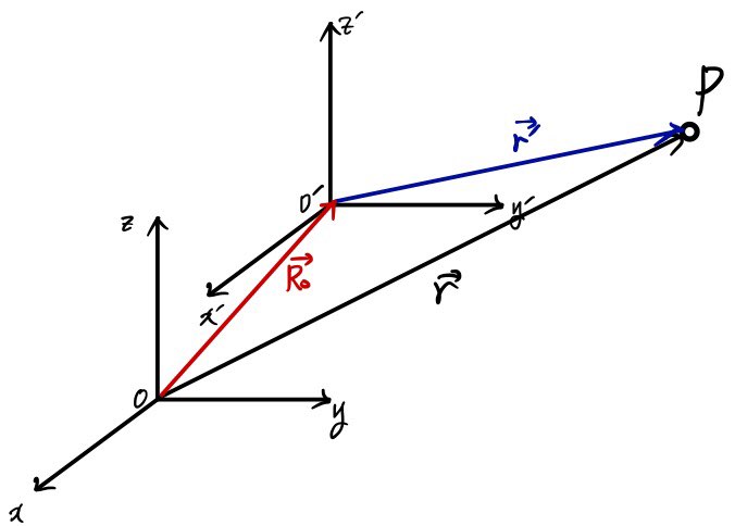 $$\vec{v} \;=\; \vec{V}_0 \;+\; \vec{v}' \\ \vec{a} \;=\; \vec{A}_0 \;+\; \vec{a}'$$V and A are the velocity and acceleration of the moving coordinate system. v and a are point P’s velocity and acceleration as seen from Oxyz. v’ and a’ are point P’s velocity and acceleration as seen from O’x’y’z’.