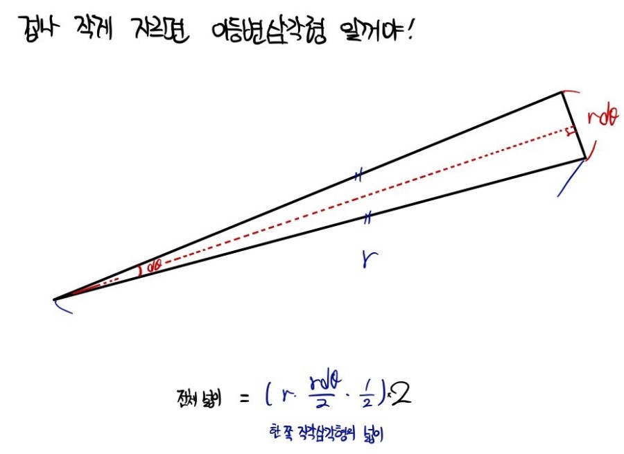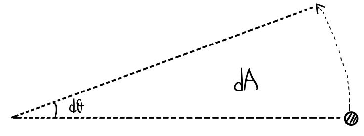 $$L\text{ magnitude}\quad \text{constant}\quad =\quad \left| \overrightarrow {r}\times (m\overrightarrow {v}) \right| =m\left| r\hat {r}\times \left( \dot {r}\hat {r}+r\dot {\theta}\hat {\theta} \right) \right| \\ =\quad m\left| r^{2}\dot {\theta}(\hat {r}\times \hat {\theta}) \right| \quad =\quad mr^{2}\dot {\theta}\quad \text{constant} \\ l\equiv \frac {L}{m}=r^{2}\dot {\theta}\quad \text{this is}\quad \text{constant}$$Now let’s compute the areal velocity as the planet moves. First, the area itself!!!!