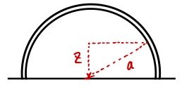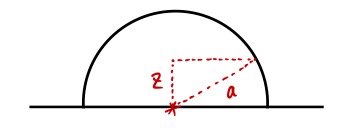 $$\text{radius of the ring at height } z \;:\; \sqrt{a^2 - z^2}$$$$\text{circumference of that ring}\;:\; 2\pi\sqrt{a^2 - z^2}$$$$\text{stack the ring by } dz \;:\; 2\pi\sqrt{a^2 - z^2}\,dz \quad (\text{i.e., volume of the oh-so-thin ring})$$$$\text{mass of that ring}\;:\; 2\pi\rho\sqrt{a^2 - z^2}\,dz$$$$\therefore \vec{z}_{cm} \;=\; \frac{\int \vec{z}\,2\pi\sqrt{a^2 - z^2}\,dz}{\int 2\pi\sqrt{a^2 - z^2}\,dz}$$Originally written in Korean on my Naver blog (2015-01). Translated to English for gdpark.blog.