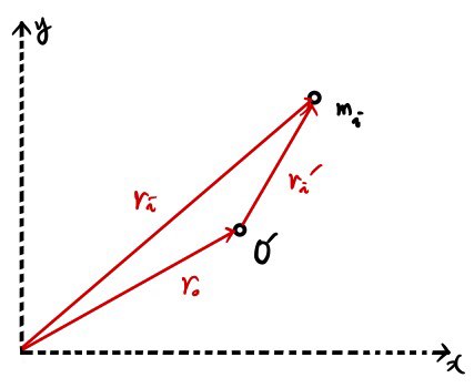 Since we’re in “rigid body undergoing planar motion” territory now, I’m gonna introduce a new origin $O'$ โ the origin of the coordinate system we’ll use when we care about the rotation of the particle system.