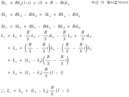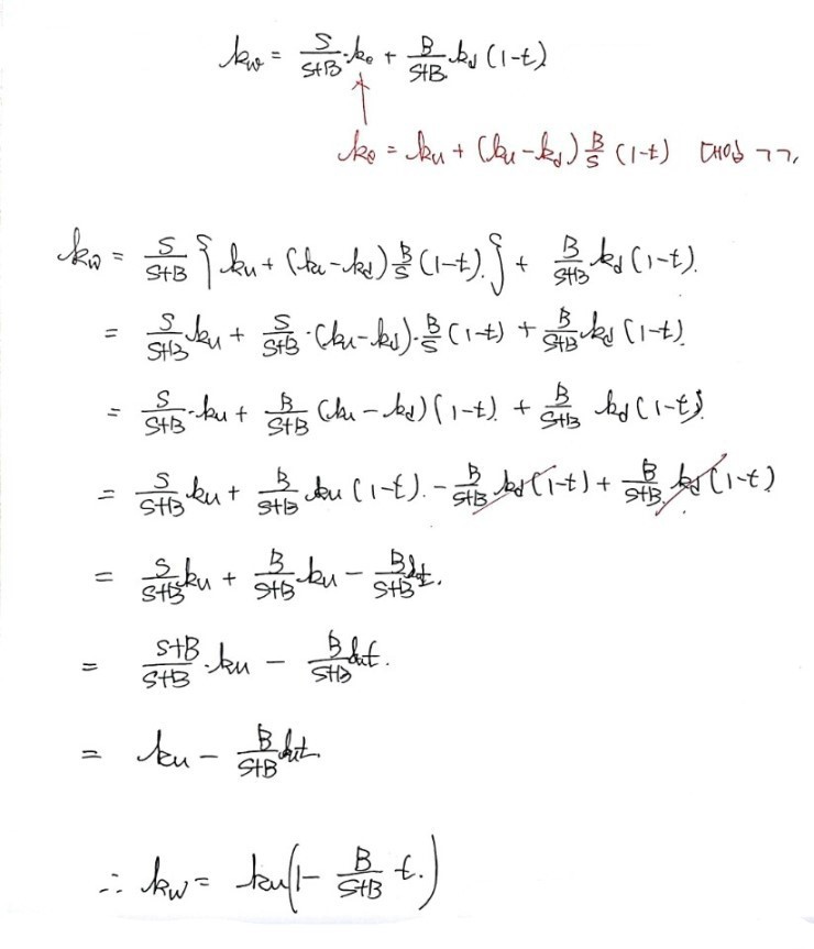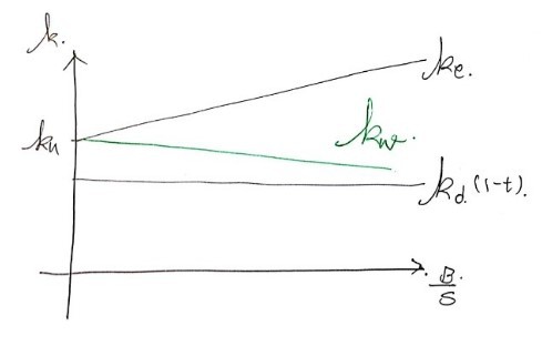 What this equation is saying — it’s packed with the meaning “the weighted average cost of capital decreases in proportion to the debt ratio (debt / total assets = $B/(S+B)$)” ;