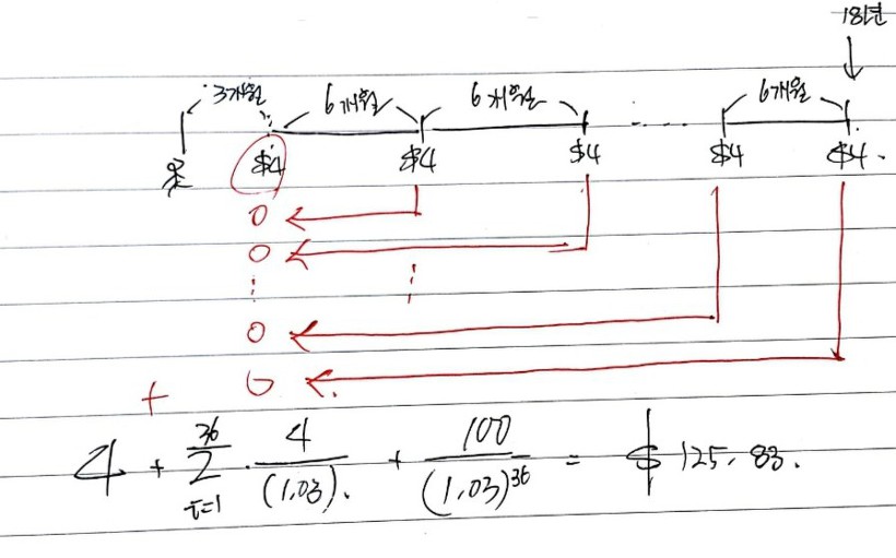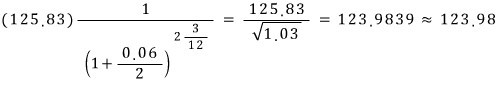 So $125.83 is the value 3 months from now. We need to pull it back another 3 months โ discount it forward 3 months at 6% on a semiannual-compounding basis:
