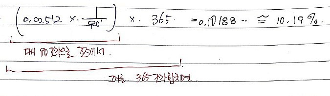 Short-term money market instruments often just quote the discount rate. So if a 91-day T-bill has “8” written on it, that means an interest rate of 8%. And T-bills use that third method โ actual/360. So the interest amount on this 91-day, 8% T-bill is: