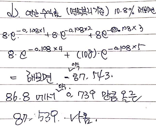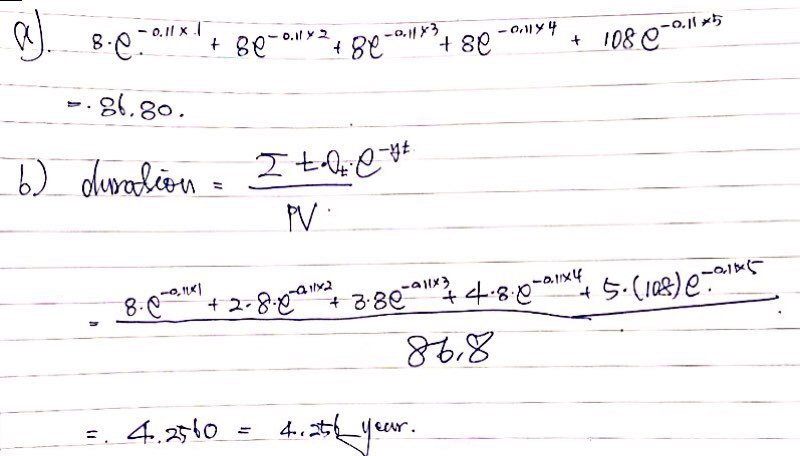 A 5-year bond, yield 11% per annum continuously compounded, paying 8% coupon at year-end (face $100).