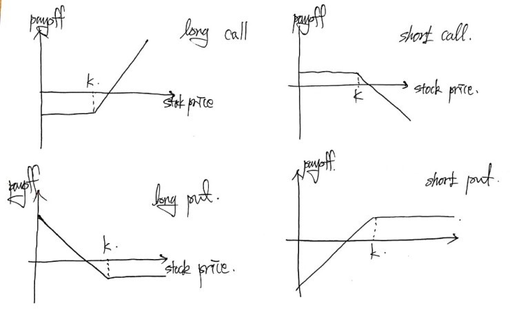 Now, the payoff at maturity for: buying a call (long), selling a call (short), buying a put (long), selling a put (short) — i.e., the picture of “intrinsic value”: