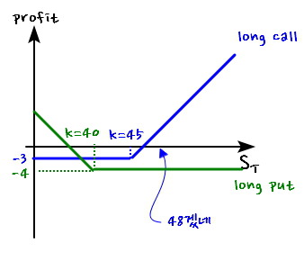 A trader buys a call with strike $45 and a put with strike $40. Same maturity. Call costs $3, put costs $4. Draw a graph of the trader’s profit vs. underlying price.