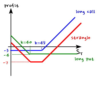 Buying a call and a put with different strikes but same maturity and underlying — that’s a strangle, and I have no idea why it’s showing up at this point in the chapter,