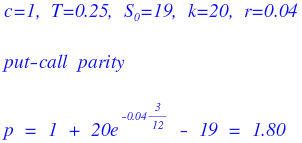 Non-dividend-paying stock at $19. A 3-month European call on it costs $1. Strike is $20, $r = 4\%$. What’s the price of the matching 3-month European put?