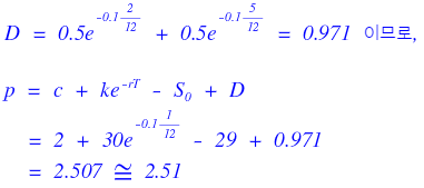 So I’ll plug into the dividend-adjusted put-call parity. Easy. The only mildly annoying part is computing the present value of the two dividends, $D$.