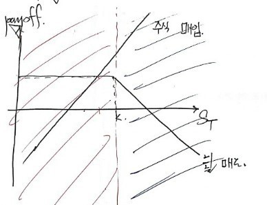 (I don’t know if everything I want to say is going to come through in just words, but let me try. In the red region, the portfolio payoff is the original “buy stock” graph shifted up by +call premium. In the second region the slope is 0, so it’s a horizontal line — but at what level? How do we find that?)