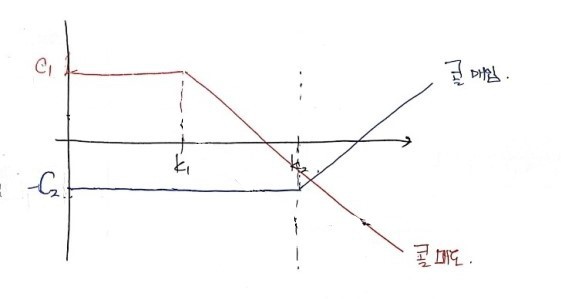 Why? If you combine those, the flat-line payoff comes out negative. Lower $k_1$ → call gets more expensive, put gets cheaper. That’s the property we just used. And that property is exactly what flips the sign.