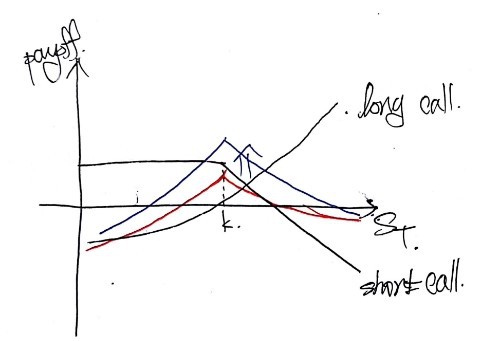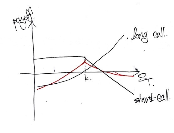 Position: buy the higher-strike option & sell the lower-strike option. For this one too — without thinking — let’s start with calls. Sell the lower-$k$ call, buy the higher-$k$ call. Stack their payoffs on one set of axes: