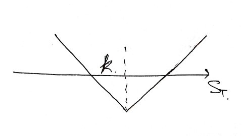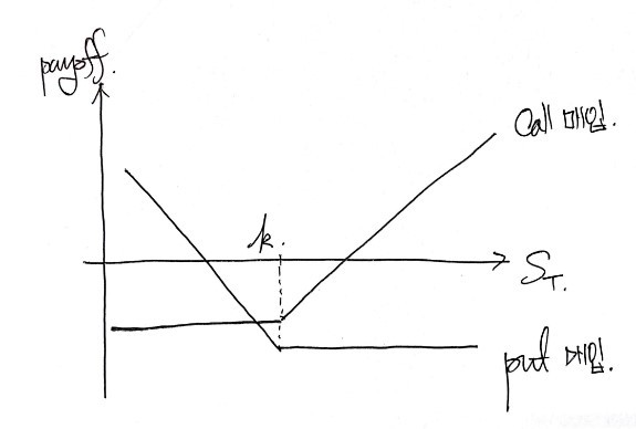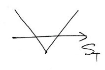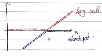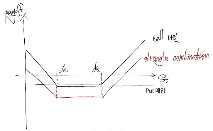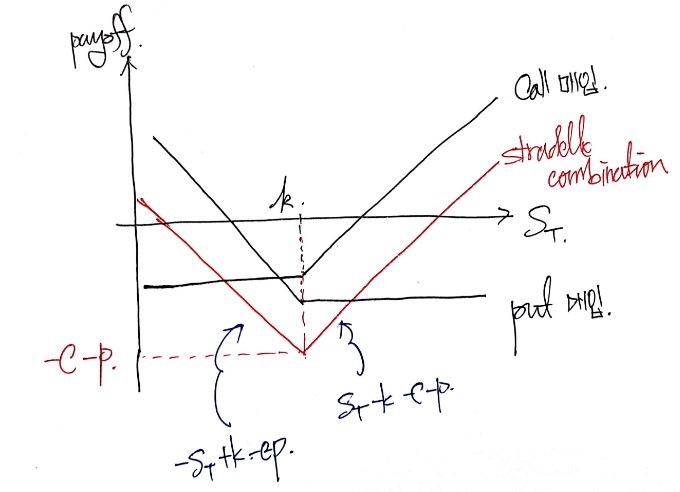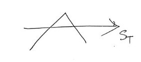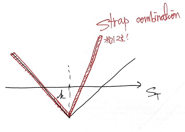 Now here’s the thing. If $S_T$ at expiration lands somewhere near $k$, the person sitting in the bottom straddle position (yes, that’s the actual name — long $c$ + long $p$) eats a fat loss.