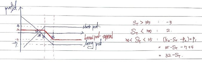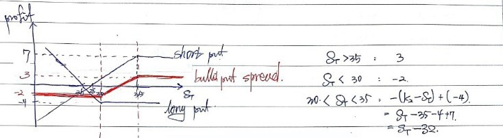 Puts with strikes 30 and 35 cost 4 and 7 respectively. Build a bull spread and a bear spread with them. Make payoff/profit tables.