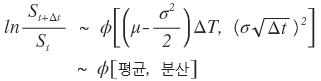The thing to notice: that epsilon ($\varepsilon$) sitting in there is a random number drawn from a Gaussian distribution. Which means — automatically, no extra work — the log return is normally distributed.