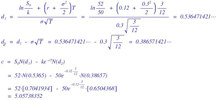 Current stock price $52, strike $50, risk-free rate 12%, volatility 30%, maturity 3 months. What’s the price of a European call on a non-dividend-paying stock?
