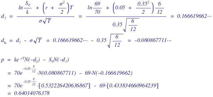 Current stock price $69, strike 70, risk-free rate 5% per year, volatility 35% per year, maturity 6 months. Price of the European put on a non-dividend-paying stock?