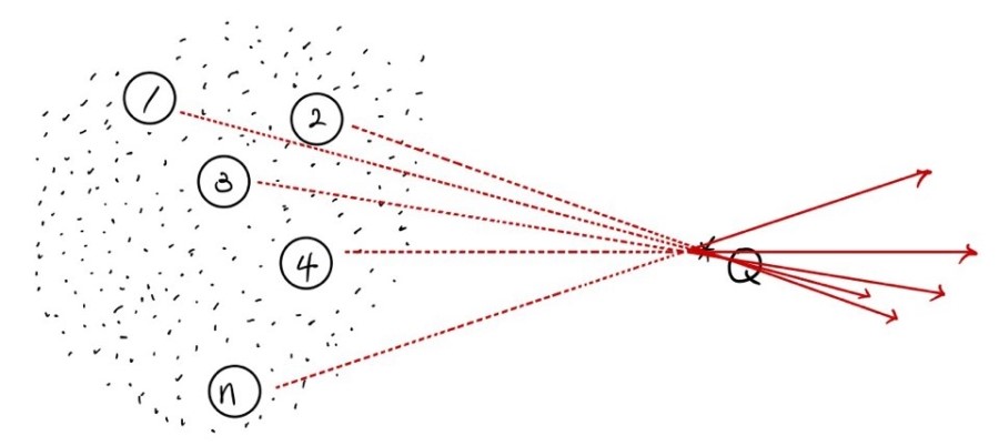 The test charge Q, due to each of the point charges q1, q2, q3, q4, q5……. qn, will receive Coulomb forces