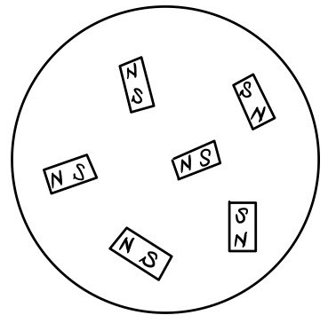 Alright alright alright, at first the atomic arrangement of the matter is all every-which-way, so when you add up all those magnetic dipole vectors it becomes 0 and no magnetic field forms,
