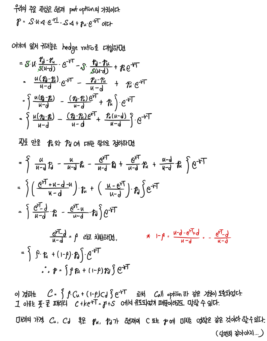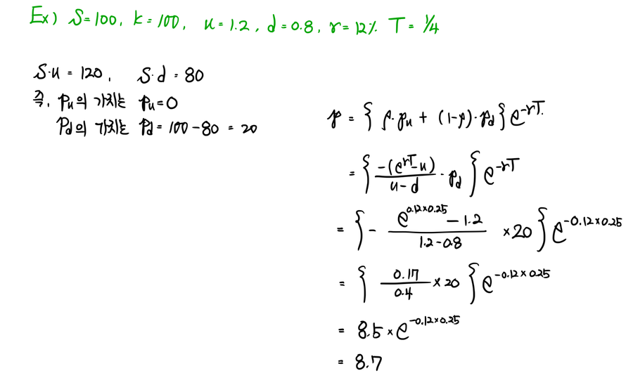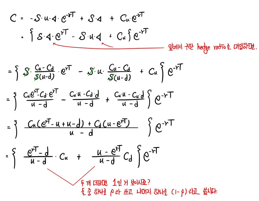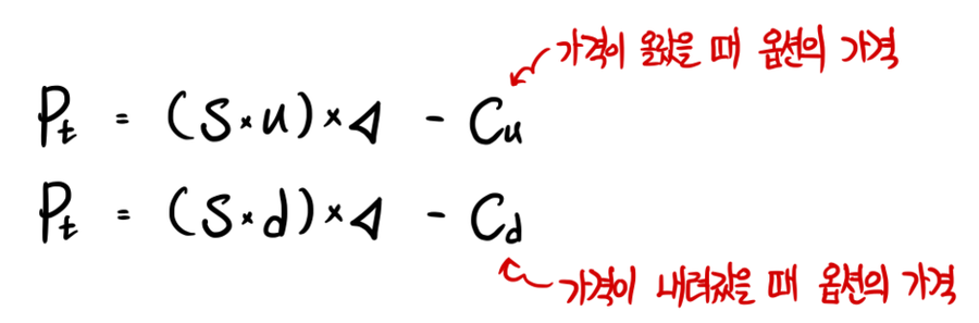 <$c_u$, $c_d$ — same thing as before: if $S \geq K$ then $c = S - K$, if $S < K$ then $c = 0$.>