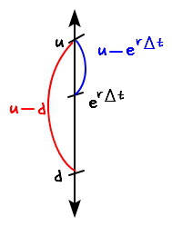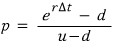 u is the multiplier when it goes up, d is the multiplier when it goes down. So u-d is the total “size” of the move, and exp(rΔt)-d is the chunk of that u-d size that’s in the upward direction.